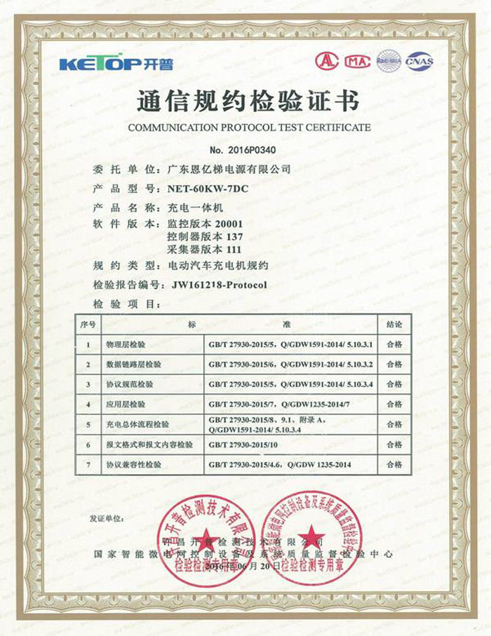 通信規(guī)約檢驗(yàn)證書(充電一體機(jī))