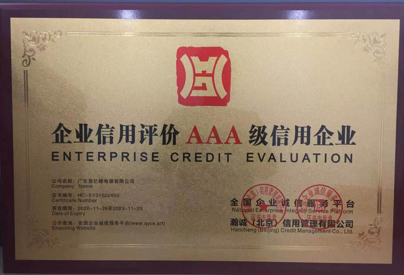 企業信用等級AAA證書